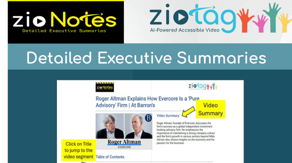 ZioNotes offers AI Powered Summarization, Transcription, Translation, and Dubbing solutions. Everyone loves seeing their favorite podcast in a clean, neat, and concise "Detailed Executive Summary" document. With ZioNotes, users receive detailed video summaries, time-stamped notes highlighting key points, and enhanced video players with an actionable table of contents. This makes it easier to navigate and engage with video content efficiently. Supercharge your podcast with a beautiful "visual roadmap" of the content inside your ( or anyone's ) video or audio podcast. A fan favorite at major universities and research facilities, now its available for everyone.